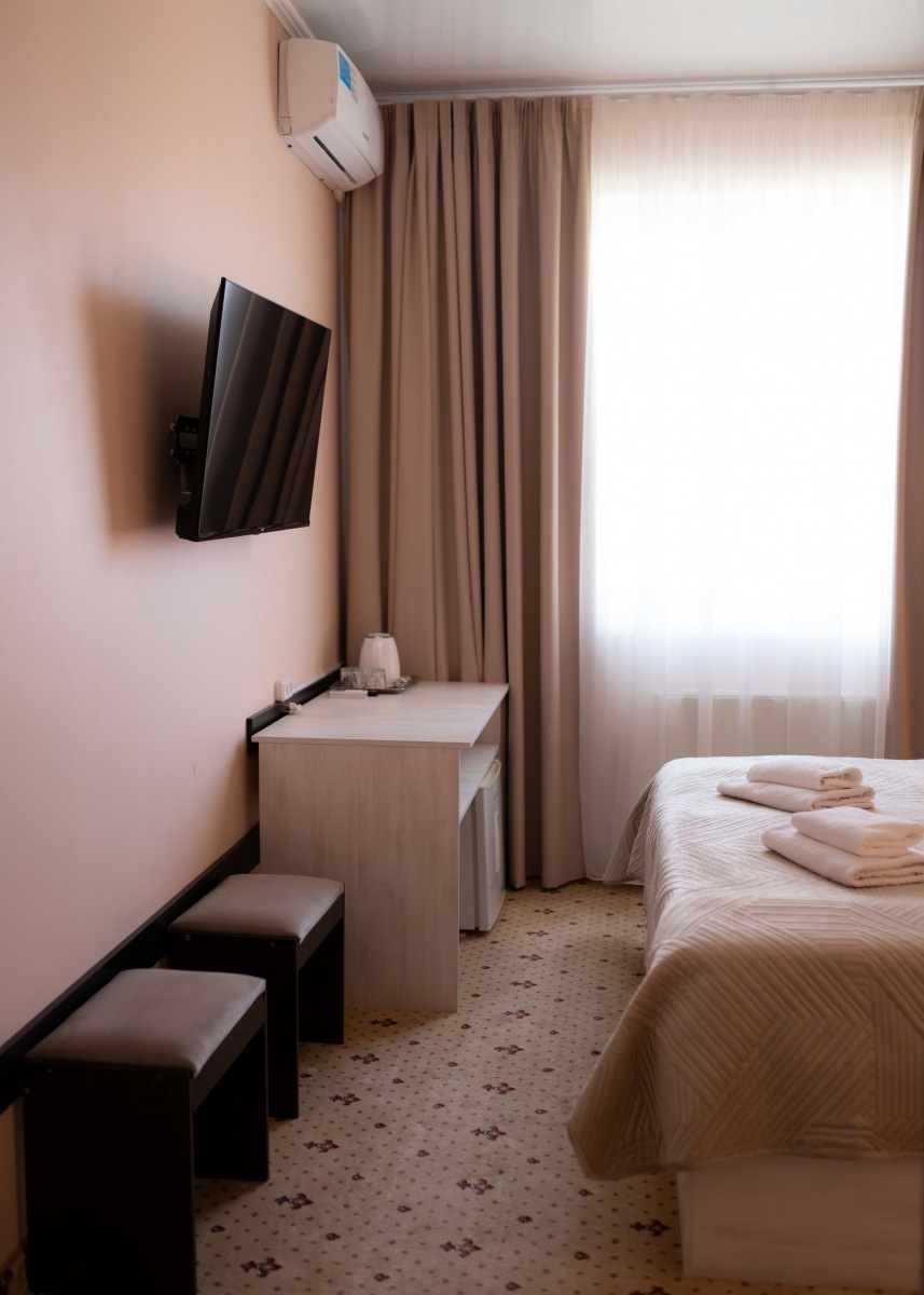 Комфортный однокомнатной номер категории «Стандарт улучшенный». Двухместный номер выполнен в тёплых тонах, обставлен современной мебелью и всем необходимым для комфортного отдыха.